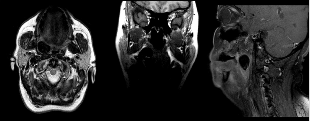 AbstractTonsilloliths are calcified masses which present in tonsillary cripts. They often contain calcium carbonate, oxalate, other magnesium salts, and ammonium radicals. They may cause complaints such as halitosis, difficulty swallowing, sore throat, and referred otalgia related to their size and location. It may go asymptomatic and may detect a submucosal or intratonsiller mass in routine controls. The diagnosis can be made clinically, as well as through direct radiography, CT, and MR imaging. In treatment, excision of tonsillolith is feasible, and in some cases, releated tonsillectomy can also be done. In this case, a giant tonsillolith located in the right palatine tonsil lodge and causing complaints of sore throat and dysphagia is presented.IntroductionTonsil stones are calcified formations that develop in the crypts of the tonsils. These precipitates frequently comprise calcium carbonate, oxalate, additional magnesium salts, and ammonium radicals [1].The precise mechanisms underlying these formations remain to be fully elucidated. The prevailing hypothesis suggests that caseous material accumulates in the tonsil crypts, where it combines with filaments of bacteria, such as Leptothrix buccalis, which are associated with chronic tonsillitis [1, 2]. Depending on the size and location, the condition may present with symptoms including halitosis, dysphagia, sore throat and referred otalgia [2, 3]. It is important to note that these lesions may be asymptomatic and, as such, may be identified during routine controls as an intra-tonsillar or submucosal mass. Although it can also be observed in children, it is most frequently observed in adults, with an average age of 50 years [2]. A clinical examination may reveal the presence of the condition in the tonsillar crypt, or it may be palpated as a hard mass in the tonsillar tissue. The diagnosis can be made clinically, or by means of direct radiography. CT and MR imaging can also be used. In the treatment, the removal of the stone, along with the removal of the associated tonsil in some cases, may be performed. The presented case involves a giant tonsillolith with unilateral localization and a preliminary diagnosis of malignancy. The etiology of this condition is discussed in the context of existing literature on the subject. Case ReportA 51-year-old female patient attended the outpatient clinic and presented with symptoms of a sore throat on the right side of her neck and discomfort during swallowing. These symptoms had been gradually worsening over the course of the past six months. A thorough examination of the oral cavity of the patient revealed the presence of swelling in the right tonsillar lobe and the right lateral part of the soft palate. Additionally, the right palatine tonsil exhibited signs of swelling and medial pushing. Bimanual palpation revealed that the right palatine tonsil was large and firm in consistency. Magnetic resonance imaging (MRI) was performed at a different healthcare facility with prediagnoses of malignancy and tonsil stones. A 2x1 cm hypointense area with sharp borders to surrounding tissues and no contrast enhancement was observed on MRI imaging in the right palatine tonsil fossa. (Figure 1).