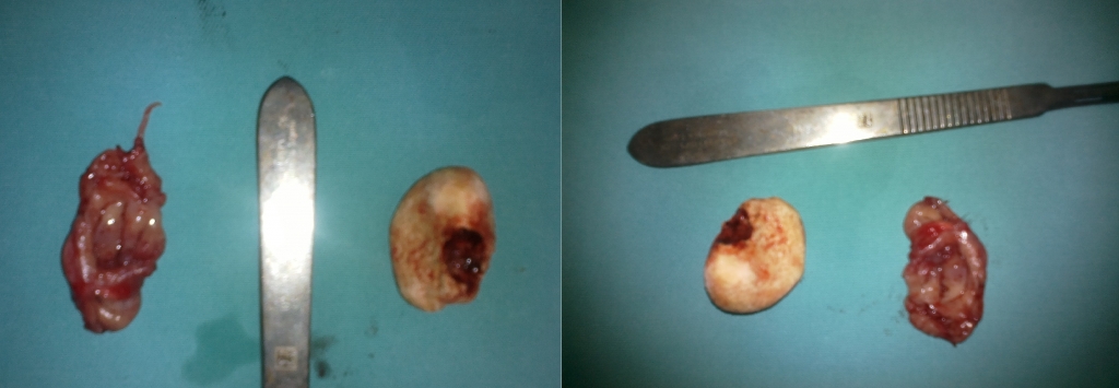 The patient underwent a surgical procedure under general anaesthesia, during which a tonsillar stone measuring approximately 2x1 cm was extracted from the tissue of the right palatine tonsil. The excision of the right palatine tonsil was also performed (Figure 2).